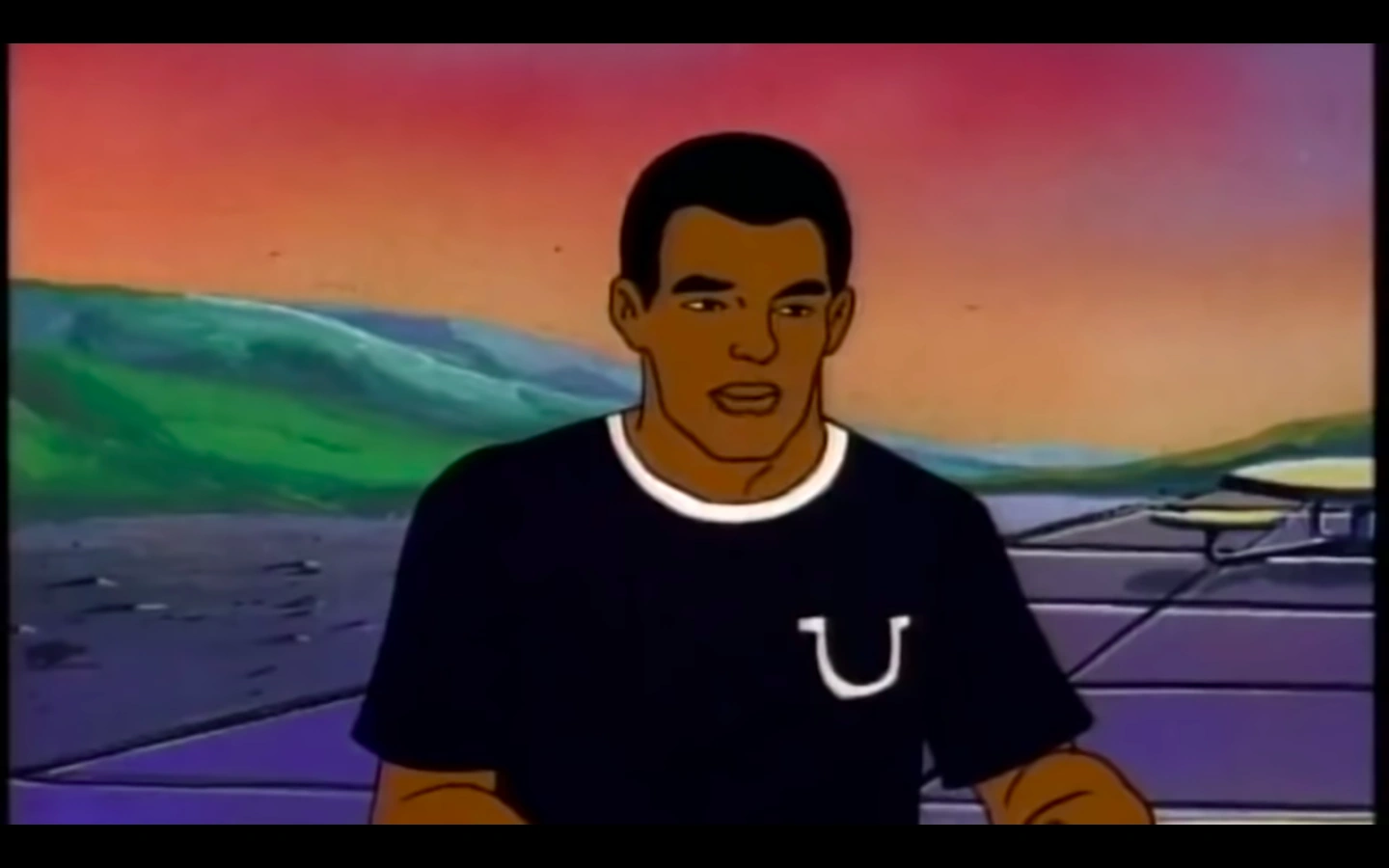 Jets is an African-American man with short black hair, brown skin and black eyes. He wears a black T-shirt with a white horseshoe design at the left, orange jean shorts with a black belt around his waist and white sneakers and black socks.